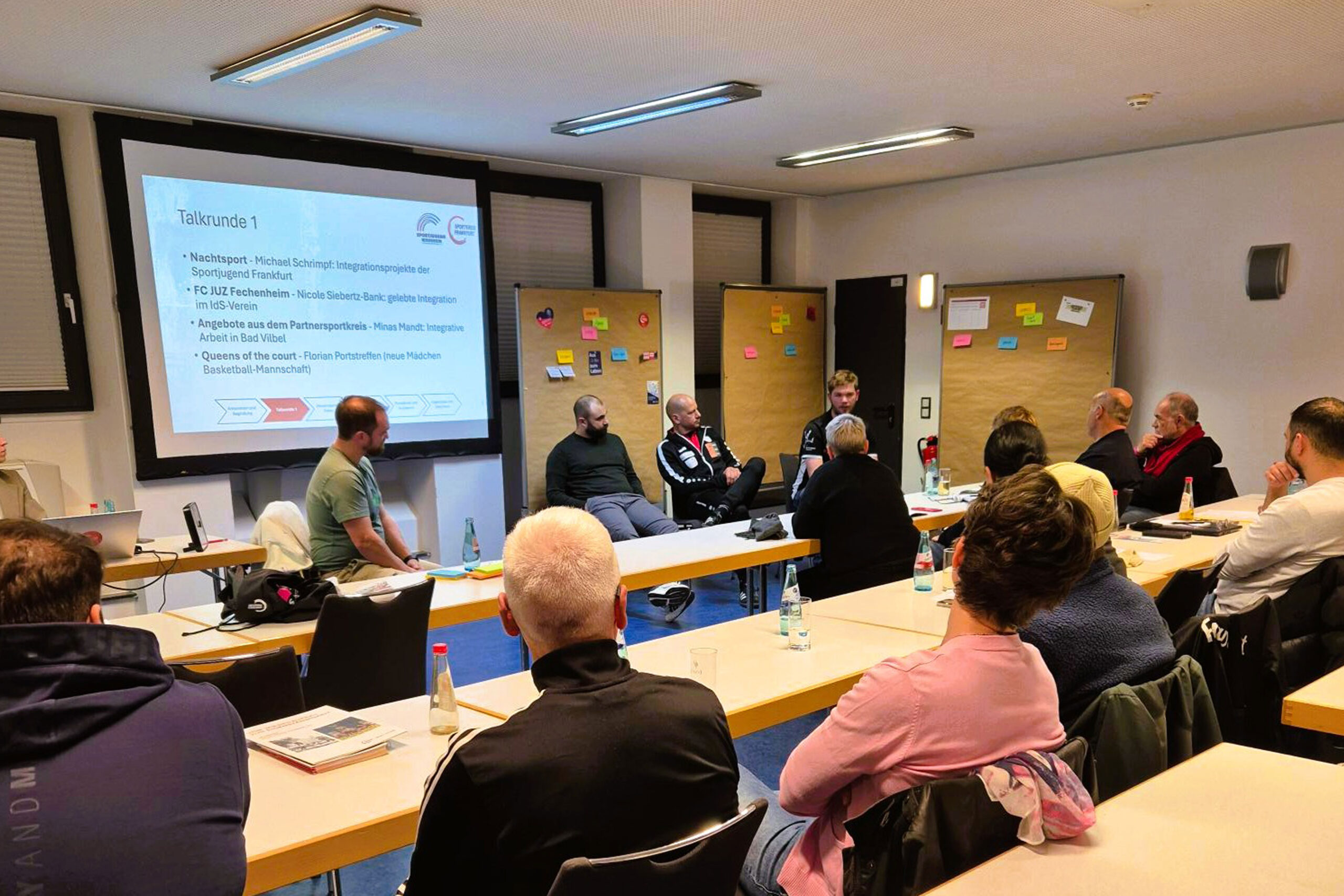 Lucia Krämer, Projektleiterin des Sportkreis Frankfurt für das Landesprogramm „Sport integriert Hessen“, und Markus Wehenkel, Referent der Sportjugend Hessen (Referat „Vielfalt im Sport“), hatten das Programm zusammengestellt. Entlang von ausgewählten Schlaglichtern wurde u. a. über folgende Aktionen und Projekte berichtet und gemeinsam beraten: mobile Jugendarbeit der Sportjugend Frankfurt im Nachtsport für 15 bis 27-Jährige; der Alltags-Fitness-Test in Frankfurter Stadtteilen für Menschen ab 60 Jahren; neue Angebote für Mädchen-Basketball mit Aufnahme in den Sportverein; erfolgreiche Kooperationen von Sportangeboten in der Region von ehrenamtlichen Sport-Coaches; Bewegungsangebote im Sozialraum, die vom jeweiligen Quartiersmanagement koordiniert werden. Dabei ging es um zusätzliche Kooperationsideen rund um Sport und Bewegung, um mögliche Angebote in der Zusammenarbeit mit den Trägern der Sozialarbeit in verschiedenen Stadtteilen und um bereits geplante Termine. So ist ein integratives Sport-Festival der Sportjugend Hessen im September 2026 in Frankfurt in Planung.